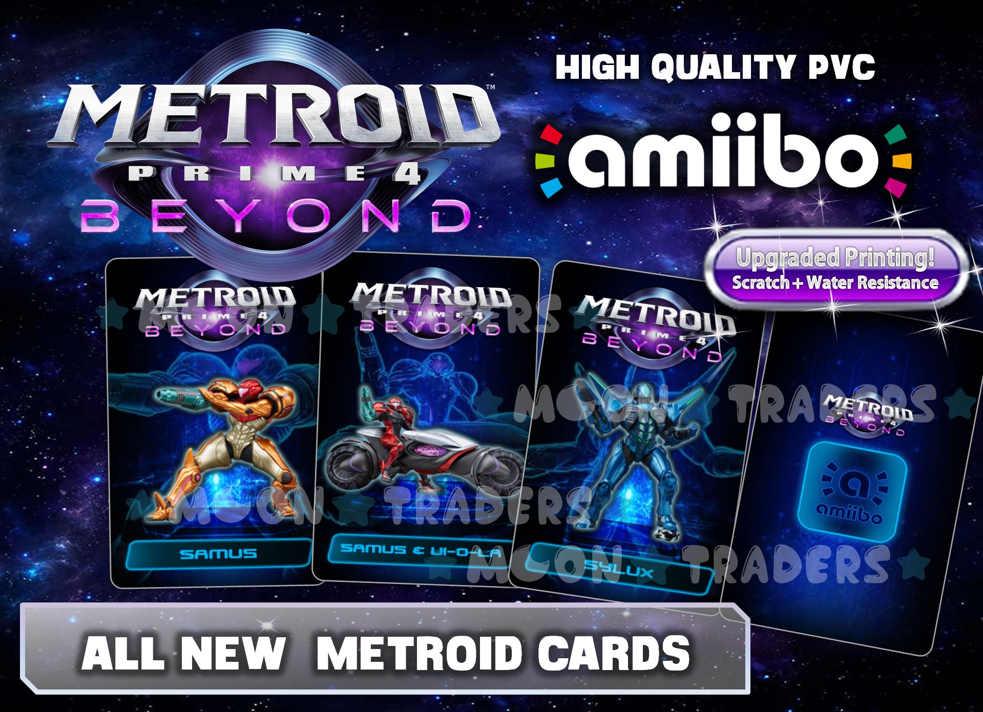 Enjoy these quality PVC cards with vibrant Metroid series art. Now scratch + water resistant!